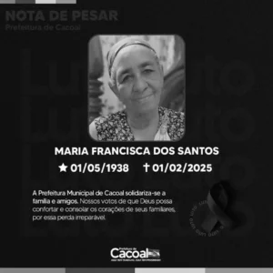 Em NOTA DE PESAR, a Prefeitura Municipal de Cacoal expressou profunda comoção com a perda da moradora, destacando sua importância para a história da cidade. “Neste momento de dor e reflexão, estendemos nossas sinceras condolências a todos os familiares e amigos de Maria Francisca. Que a lembrança de sua trajetória e o amor que ela dedicou à vida possam confortar os que ficam e inspirar as futuras gerações”, afirmou o prefeito Adailton Fúria, acompanhado do vice-prefeito Tony Pablo.