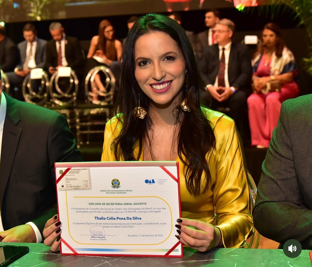 Em Porto Velho/RO, a advogada THALIA CÉLIA PENA DA SILVA de Cacoal, foi empossada no cargo de Diretora Secretária-geral Adjunta da OAB/RO, e ainda com a responsabilidade de ser a Corregedora Geral e Coordenadora do Interior do estado.